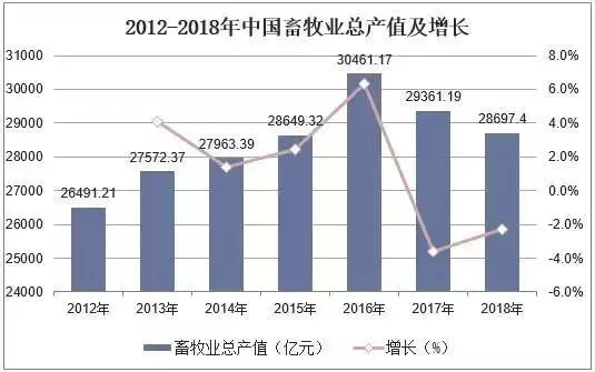 据统计,2016年中国畜牧业总产值达到30461.17亿元,2018年受宏观经济等多方面因素的影响,截至到2018年中国畜牧业总产值下降至28697.4亿元,同比下降2.3%。