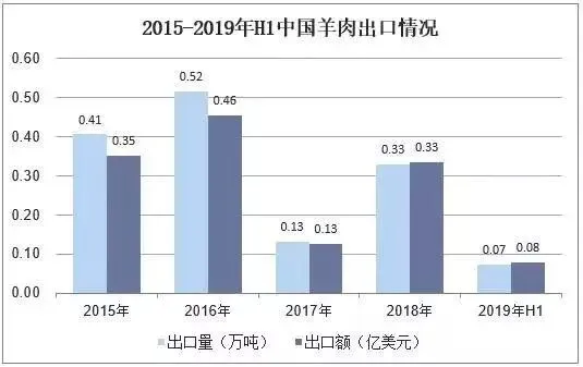 出口方面,据统计,截至到2019年上半年,中国羊肉出口量为0.07万吨,同比下降37.6%,出口金额为0.08亿美元,同比下降30.2%。