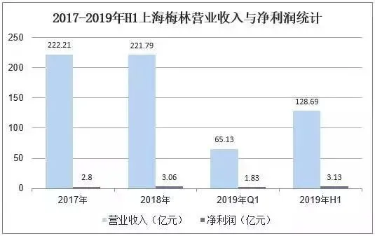 据统计,截至到2019年上半年,上海梅林营业收入为128.69亿元,同比增长8.8%,净利润为3.13亿元,同比增长8.8%。