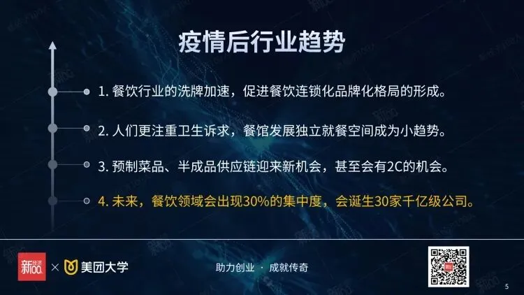 刚才已经分析过,大概五到八年餐饮总规模达到六到八万亿市场规模。我认为会出现30%的集中度,像路边摊、街边店、卫生条件不好的一些小店应该会慢慢地被淘汰,未来一定会出现以腰部商家为主体的餐饮连锁品牌会出现,特别是疫情将加速这一趋势的到来。
