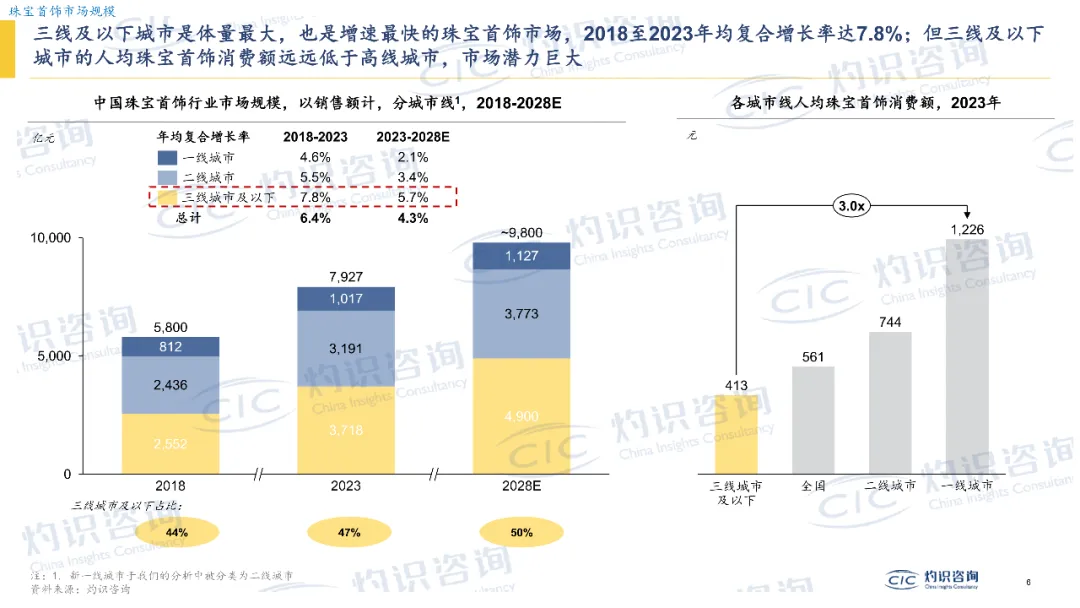 •下沉市场潜力爆发:从消费层级看,三线及以下城市成为增长引擎——2023 年三线及以下城市人均珠宝消费增速达 7.8%,显著高于一线城市(4.6%)和二线城市(5.5%)。