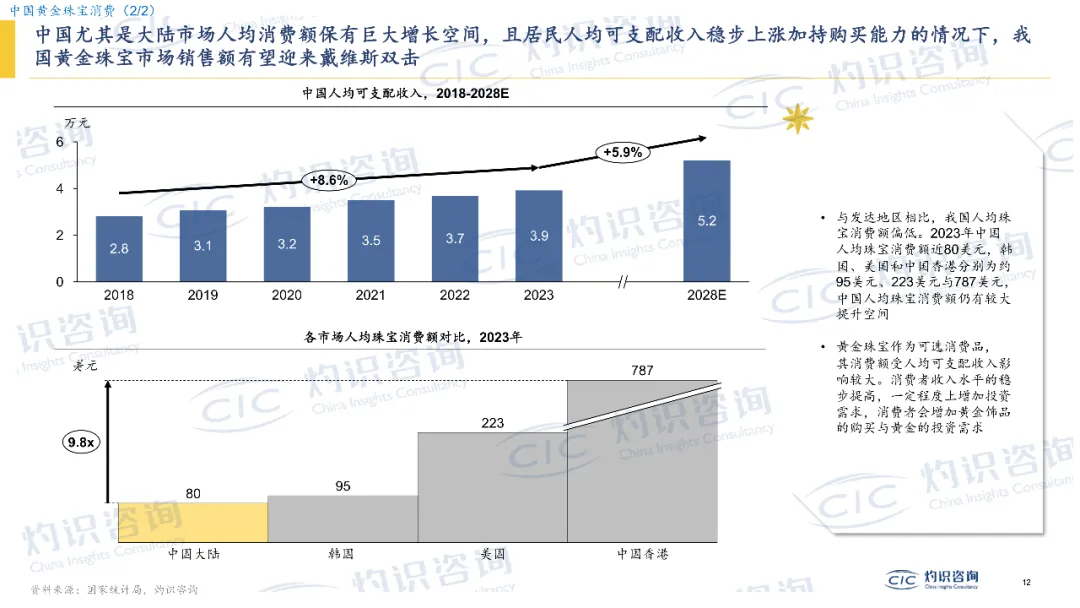 •人均消费“补涨空间” 大:尽管消费规模领先,但2023 年中国人均珠宝消费额仅约 80 美元,远低于韩国(95 美元)、美国(223 美元)和中国香港(787 美元)。随着人均可支配收入提升,这一差距正是未来增长的关键潜力。