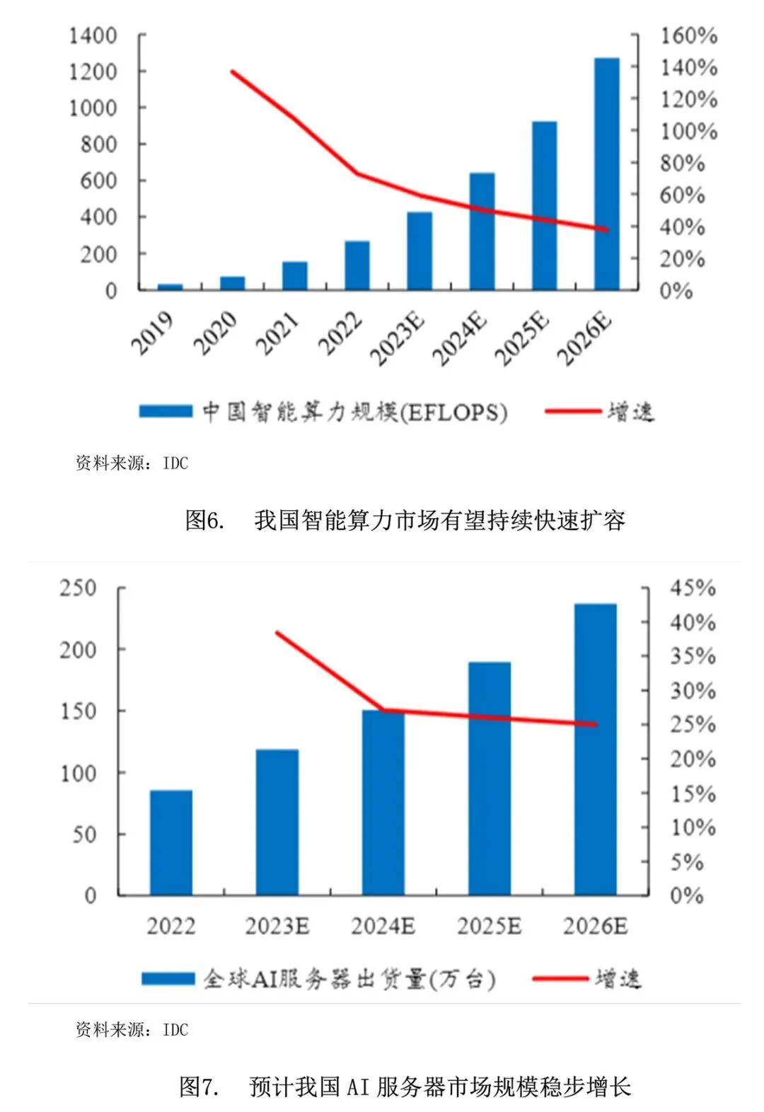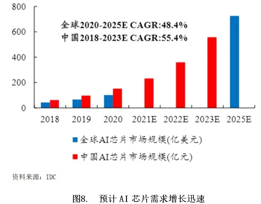 AI大模型训练需要强大的数据处理能力,推动算力需求持续增长。AI大模型训练需要强大的数据处理能力。随着大模型持续推出及升级迭代,AI算力需求持续增长。根据IDC的数据,我国智能算力市场规模预计将从2019年的31.7EFLOPS增长至2026年的1271.4EFLOPS,CAGR高达69.4%。具体而言,算力基础设施主要包括AI服务器、AI芯片、数据中心等。AI服务器领域,目前AI服务器以CPU+GPU形式为主,可支持大规模的深度神经网络模型训练并提高训练的精度,具有明显的计算效率优势,因此需求有望持续增长。根据机构预测,全球AI服务器(包含搭载GPU、FPGA、ASIC等)出货量预计将从2022年的85.5万台增长至2026年的236.9万台,CAGR为29.0%。AI芯片领域,AI芯片是核心算力硬件,除CPU外,还包括高效支持AI应用的GPU、FPGA等通用芯片以及专门为特定的AI产品设计的ASIC芯片等,主要用于辅助CPU进行加速计算。AI芯片占据AI服务器的主要成本,根据IDC的数据,芯片成本在基础型服务器中约占32%,在更高性能的服务器中,芯片相关成本占比高达50%-83%。在算力需求激增的背景下,AI芯片需求有望持续增长。根据统计数据,全球AI芯片市场规模预计将从2018年的43亿美元增长至2025年的726亿美元,2020-2025年CAGR达48.4%,而我国AI芯片市场规模预计将从2018年的61亿元增长至2023年的557亿元,CAGR达55.4%。数据中心领域,数据中心作为算力的重要载体之一,需求将随着大模型算力需求增长而增长。根据统计数据,我国数据中心市场规模预计将从2014年的372亿元增长至2024年的6123亿元,CAGR达32.3%。
