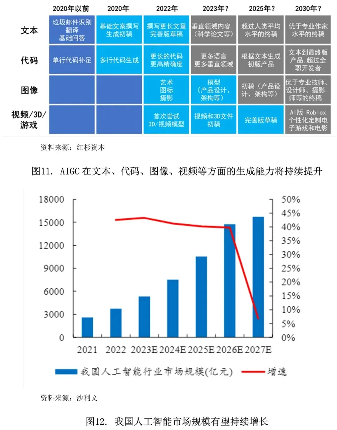 AIGC生成文本、代码、图像、视频等内容的能力持续提升,应用端发展前景广阔。大模型技术水平日益精进,感知并理解海量数据的能力持续提升,推动AIGC在文本、代码、图像、视频等内容的自动生成方面不断取得突破。在AIGC的加持下,内容生成领域在自动生成、提高丰富度和准确性、降低制作门槛及生产成本方面成效显著。同时,多模态大模型的出现使得多领域融合成为可能,提升AIGC的可用范围。因此,AIGC在自动驾驶、智慧工业、电商、游戏、文娱、金融、工业、政务、医疗越来越多的领域得到广泛应用。应用领域持续开拓推动人工智能行业持续扩容。我国人工智能市场规模预计将从2021年的2607亿元增长至2027年的15732亿元,CAGR达34.9%,其中自动驾驶是人工智能的最大应用领域,市场份额预计将从2022年的38%提升至2027年的52%。