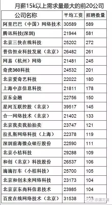 鉴于北京计算机/通信的硕士毕业生的平均薪水在10k-15k左右,我们来看一下哪些公司对15k月薪以上的职位需求比较大,主页君看了这张表以后想哭晕在厕所。这前20家公司你认识几个: