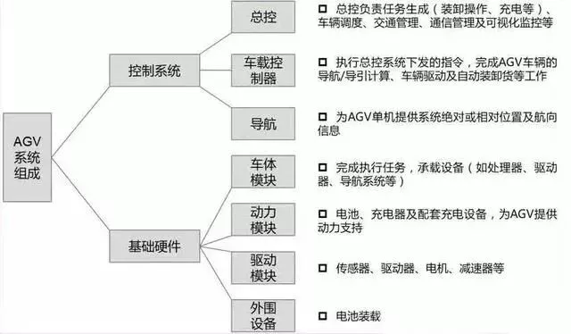从系统构成看,AGV系统主要包括两大部分,即控制系统和基础硬件。其中,控制系统主要包括总控系统、车载控制器和导航系统等部分;基础硬件主要包括车体、驱动器、传感器、电池等部分。