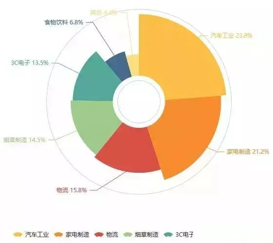 2018年中国AGV应用领域占比情况中,汽车工业领域占比最高,占比达到23.8%,其次为家电制造领域,占比为21.2%;第三为物流领域,占比为15.8%。前三领域占比超五成,达到60.8%。