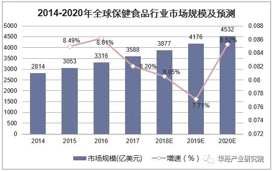 随着社会进步和经济发展,人类对自身的健康日益关注。90年代以来,全球居民的健康消费水平逐年攀升,对营养保健食品的需求十分旺盛。保健食品在欧美称为“保健食品”或“健康食品”,也称“营养食品”,德国称为“改良食品”,日本称为“特定保健用食品”,并纳入“特定营养食品”范畴。世界各国对保健食品的开发都非常重视,新功能、新产品、新造型和新的食用方法不断出现。2017年全球保健食品市场规模达到3588亿美元,同比增长8.2%。全球保健食品仍有较大市场空间,预计到2020年全球保健食品市场规模将达到4532亿美元。