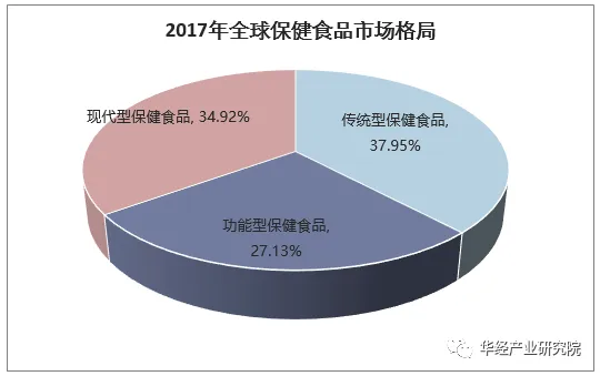 传统型保健品仍是目前全球保健品市场消费主力,2017年传统型保健品市场占整体市场的37.95%,其次是现代型保健品,占34.92%,功能性保健品占27.13%。