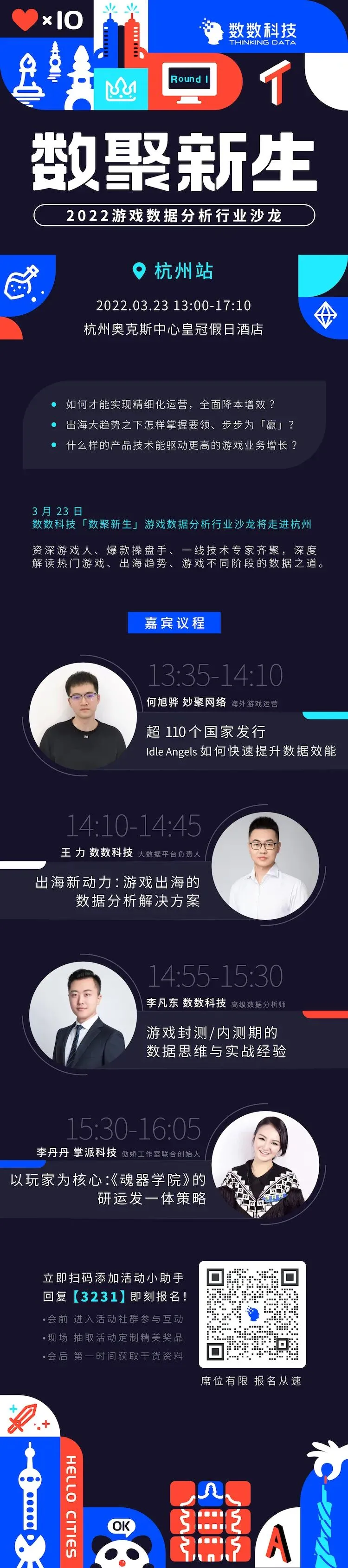 「数聚新生」游戏数据分析行业沙龙杭州首站,数数科技特邀了多位资深游戏人,他们将基于自身对游戏行业的洞察和理解,深度解读当下行业高度关注的 3 大议题。