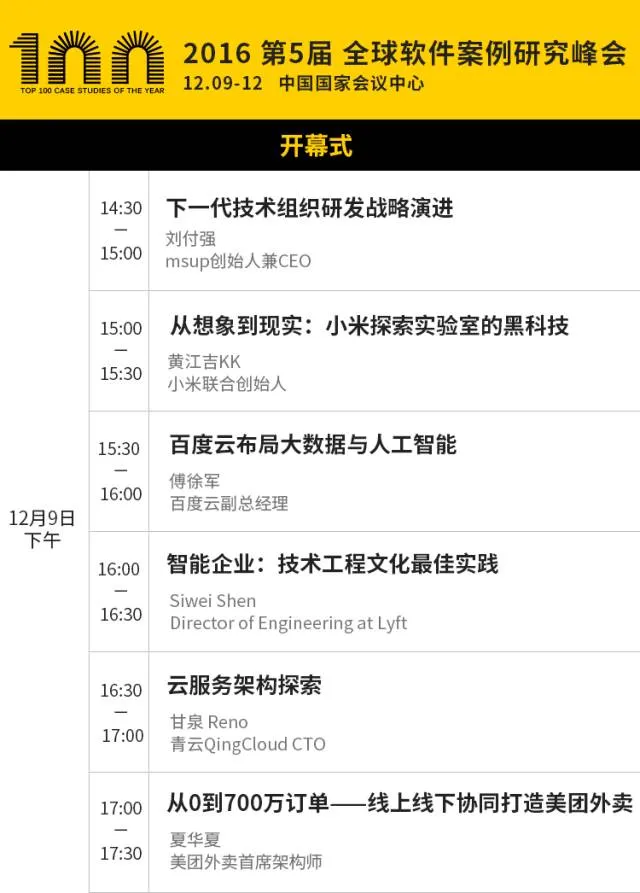 不止于18个案例,全球软件案例研究峰会共有100个年度实践,内容聚焦在技术带头人、架构师、开发经理在2016年最为关心的话题上,比如微服务、架构演进、DevOps、大前端、数据驱动、容器技术......