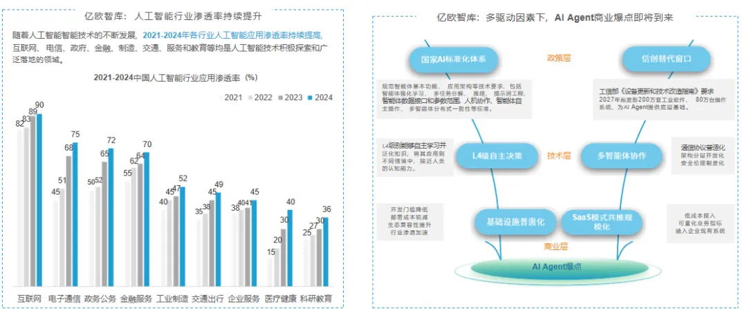 2025 年作为中国人工智能中期规划的关键节点,产业发展实现多重突破:AI 场景解决方案完成从 “能用” 到 “有用” 的进阶,在垂直行业渗透率持续攀升;Agent 发展集齐政策、技术、商业三重确定性信号 —— 国家 AI 标准化体系逐步完善、信创替代窗口持续开放,L4 级自主决策与多智能体协作技术走向成熟,基础设施普惠化与 SaaS 模式共同推动规模化落地,为商业爆点奠定基础。