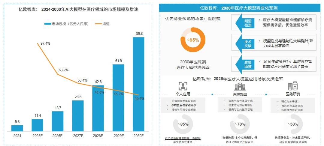 2024-2030 年医疗AI大模型市场规模将从 5.79 亿元增长至 86.83 亿元,增速呈逐年放缓态势。医院端是优先商业化场景, 2030 年渗透率预计达95% , 需求、技术、政策为核心助推因素,在病历生成、智能分诊、用药配套服务等领域实现深度应用。个人健康管理、医药研发等场景将逐步突破数据壁垒,商业化路径日益清晰。随着模型性能优化与算力成本降低,医疗 AI 将在慢病管理、公共医疗、药物研发等领域实现更广泛覆盖,各场景应用差异化特征愈发显著。