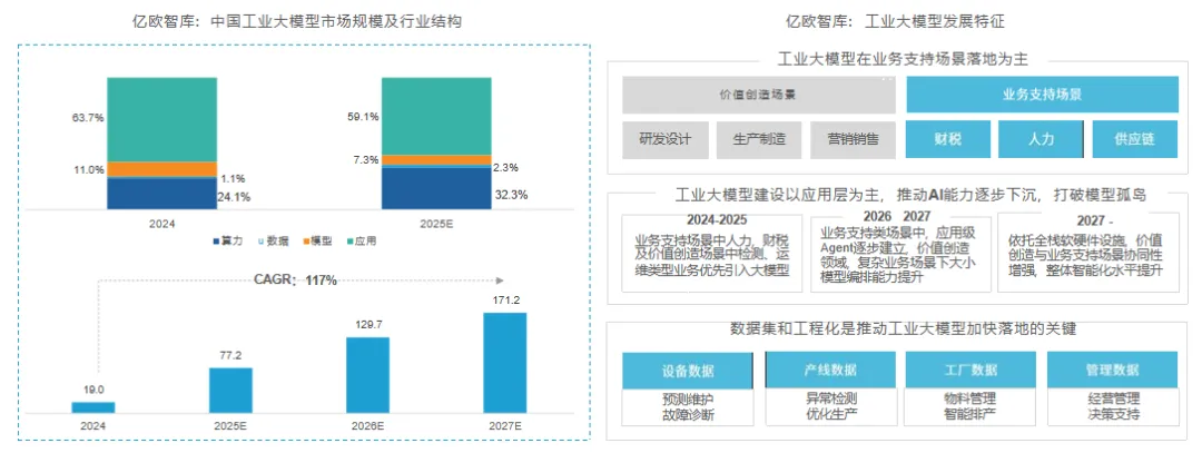 2025年工业大模型行业市场规模约为77.2亿元,行业整体投入仍以应用层及算力层为主,为保证工业大模型实际效果,工业企业格外关注与投入专业高质量数据集建设。