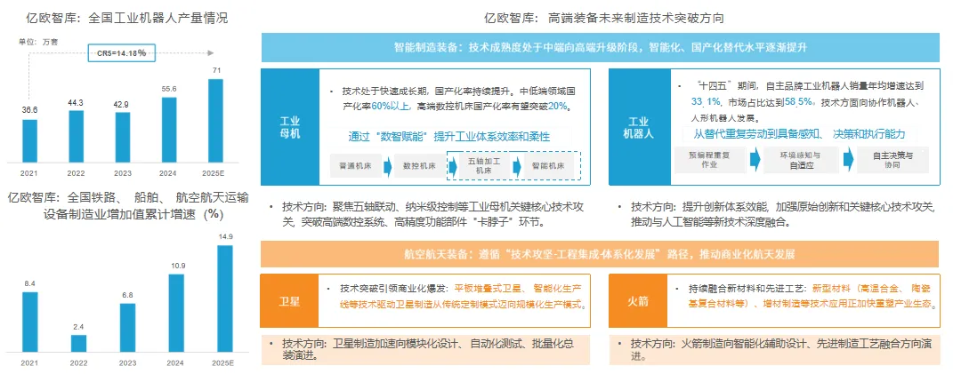 高端装备制造业具有技术密集度高、附加值突出、产业链地位关键三大特征,对工业经济拉动作用显著,具有极高的战略意义。当前,中国高端装备制造业正处于从低端加工组装向高端研发设计转型升级的关键阶段。从细分行业来看,智能制造装备领域工业母机、工业机器人等关键技术成为引领产业变革的重要力量;航空航天装备领域在国家重大专项工程战略推动下快速增长。