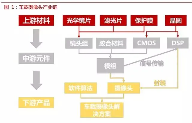车载摄像头产业链主要涉及上游材料、中游元件和下游产品三个主要环节。上游材料中光学镜片、 滤光片和保护膜等用于制造镜头组,晶圆用于制造 CMOS 芯片和 DSP 信号处理器;在中游镜头组、CMOS 芯片和胶合材料等组装成模组,并和 DSP 信号处理器封装成摄像头产品。在产业链的这一层,上游供应商已经可以向下游整车或一级供应商客户供应完整的摄像头产品。在车载摄像头产业链中,摄像头和软件算法一起,构成车载摄像头解决方案,应用于自动驾驶汽车中。