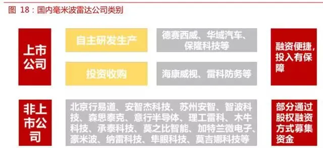 从公司类别来看,国内涉足毫米波雷达领域的公司包括上市公司和非上市公司两类。上市公司中部分公司自主研发生产毫米波雷达,包括德赛西威、华域汽车、保隆科技等,另一部分上市公司通过投资收购的方式进入这一领域,包括海康威视、雷科防务等。非上市公司主要创业公司,国内目前有十几家较大的毫米波雷达非上市公司,包括北京行易道、安智杰科技等。