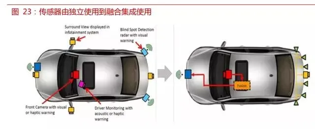 系统集成配套发展自身也是自动驾驶汽车传感器未来的发展方向。将车载摄像头、毫米波雷达和激光雷达等传感器在系统层级进行融合使用,将各个传感器获得环境信息数据进行综合分析决策对于保证车辆对周围环境的定位和理解至关重要。在高级别自动驾驶汽车中,这种系统集成配套的重要性将进一步提升。Mobileye 以车载摄像头为基础,提供“车载摄像头+算法+视觉处理芯片”的产 品组合,就是这种系统集成配套的典范。