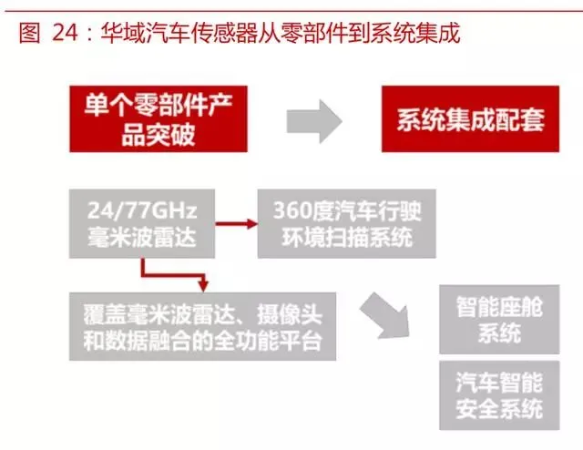 以华域汽车和德赛西威为例,国内公司在自动驾驶汽车传感器领域已经在零部件层面已经取得重要突破,目前正在以重要零部件为基础,拓展自动驾驶汽车产品领域,提升系统集成度。