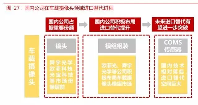 在车载摄像头领域,国内公司在镜头领域已经处于行业领先的位置,市场份额较大。目前舜宇光学、 欧菲光等公司在车载摄像头模组组装领域持续布局,产业链的进口替代率进一步提升。国内公司在 消费电子 CMOS 图像传感器领域已经取得较大进步,未来进一步拓展车载摄像头领域后,进口替 代空间较大。国内车载摄像头解决方案领域也有众多创业公司,未来有望对国外公司的产品进行替 代。