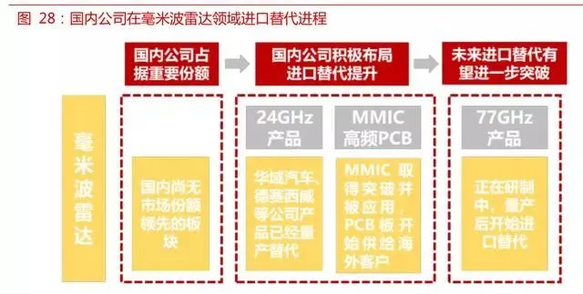在毫米波雷电领域,目前博世、大陆、海拉等国际产商占据了大部分的市场空间,但同时国内以华域汽车、德赛西威为代表的公司已经可以量产 24GHz 毫米波雷达产品,开始进口替代的过程。毫米波产品未来的发展方向是更高频的 77GHz 产品,在国内厂商达到量产条件后,进口替代将进一 步加速。