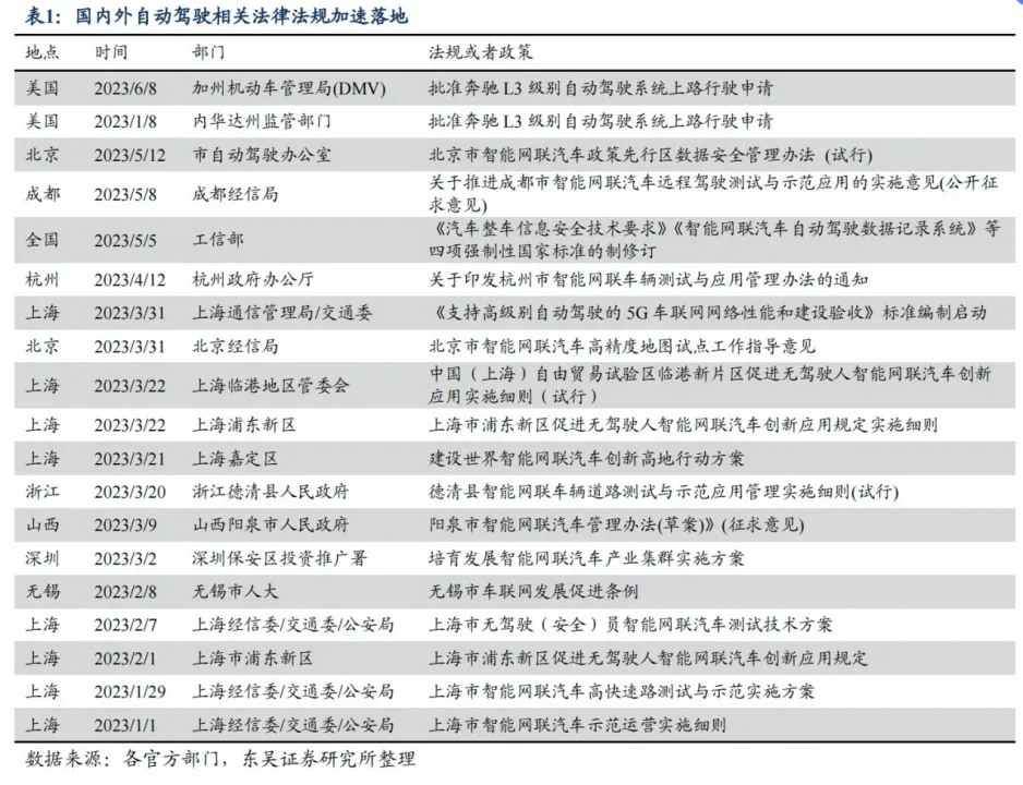 充满不确定性的自动驾驶赛道,即将迎来近年最大的确定性。6月21日,工业和信息化部(下称“工信部”)副部长辛国斌在国务院新闻办公室举行的政策例行吹风会上表示,将启动智能网联汽车准入和上路通行试点,组织开展城市级“车路云一体化”示范应用,支持有条件的自动驾驶——L3级及更高级别的自动驾驶功能商业化应用。L3级是自动驾驶中的一个分水岭。根据中国《汽车驾驶自动化分级》,目前自动驾驶技术可分为L0到L5六个等级,其中L0为人工驾驶,L1、L2依然以人类驾驶员操控为主,系统充当辅助。从L3级别功能开始,出现系统控制车辆行驶。目前,支持L3级及更高级别的自动驾驶功能商业化应用的配套政策正在制定当中。也就是说,如果智能化是新能源汽车下半场,那么此次政策的打开无异于一声哨响。和L2相比,L3车辆的自主决策占比更高,但是,驾驶员仍需要介入部分场景。因此,必须对实际操作中的安全责任做出清晰划分。事实上,自2019年L2级别辅助驾驶功能大规模量产以来,自动驾驶商用在用户端并未有质的改变。根据国际数据公司IDC数据,今年一季度L2级自动驾驶在中国乘用车市场渗透率已经达到了45.3%。然而,由于缺乏可以明确依据的责任定义,L3一直是各家车企不敢逾越的关卡。另一方面,今年以来,中国新能源车渗透率基本维持在30%左右,整体进入成长中期。因此车企迫切需要新的竞争抓手。包括自动驾驶在内的汽车智能化是必然方向。2010年以来,汽车智能化有过两次高潮:2014年-2016年,由于摄像头等视觉技术创新,Mobileye和博世等公司引领了全球 L2级别辅助驾驶。2020年-2022年,伴随大算力芯片和域控制器技术的成熟,特斯拉引领了全球准 L3 辅助驾驶浪潮。不过,L3及以上级别的自动驾驶功能,此前一直难以真正落地。原因在于交通责任的法律判定。到了L3级别,车辆的主导者由人类驾驶员转变为系统。此时,由于驾驶员身份的转变,在意外事故发生时,责任方判定变得尤为重要;且由于市场上存在大量宣称L2、L2.5、L2.9+的汽车产品,究竟L3和L3以下级别自动驾驶功能差异在哪里,均需要做出明确定义。行业普遍认为,如果没有一套完整细则判定交通责任划分,没有一家车企敢贸然跨越L3级自动驾驶。从产业发展的角度来说,随着中国电动车渗透率不断提升,车企需要差异化的产品来巩固竞争优势、拓展细分市场,因而提升了对智能化的需求。自动驾驶是一个亮点,也是一个卖点。有观点认为,今年中国汽车市场的价格战也是因为当前汽车产品过于同质,消费者期待有区别度的产品,更高水平的自动驾驶车辆或许是选项之一。这也意味着未来有能力实现L3及以上级别自动驾驶的车企将有可能建立竞争壁垒,而不具备这一能力的车企将会被加速淘汰。去年11月,国家开始对L3级别以上自动驾驶汽车的量产做出立法上的尝试。工信部等组织起草了《关于开展智能网联汽车准入和上路通行试点工作的通知(征求意见稿)》,公开征求社会各界意见。今年,根据东吴证券不完全统计,国内已有超过 17 条以上直接面向智能网联汽车相关的政策法规发布。