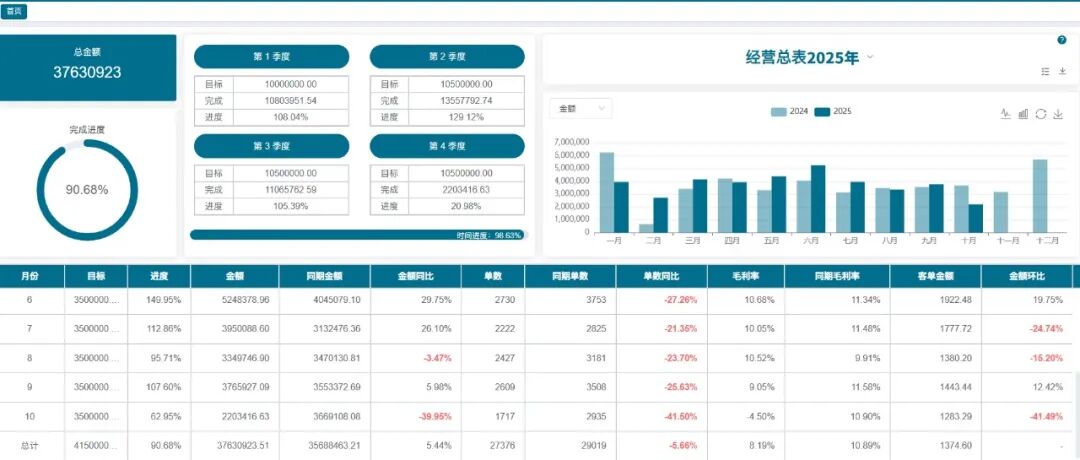 可以快速获取年度经营总额与各季度分布,还可以看到各月的各指标当期数据、同期数据和同比变化。