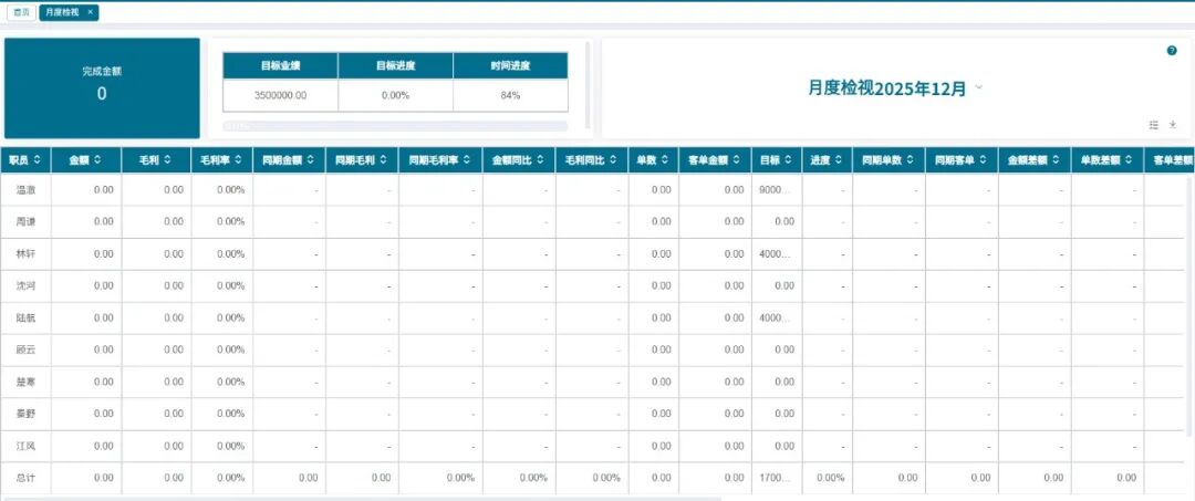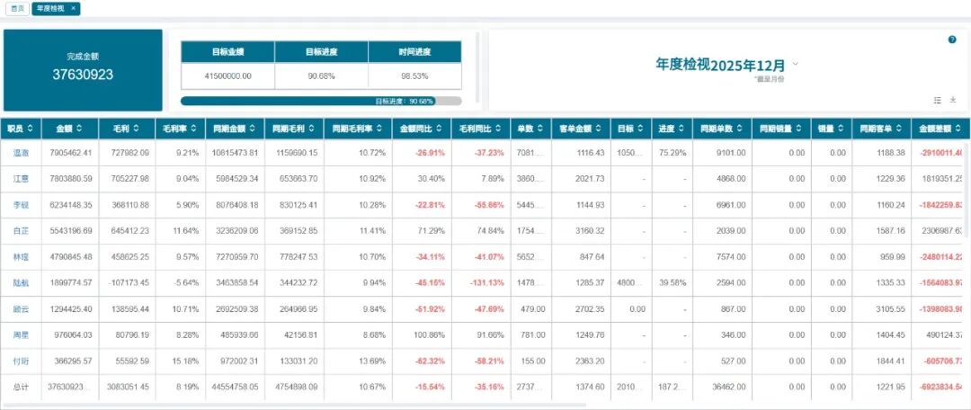◦业务员维度:关注“业绩未达标”“客户维护不均”,结合 “年度检视”“单月业务员业绩情况” 报表。