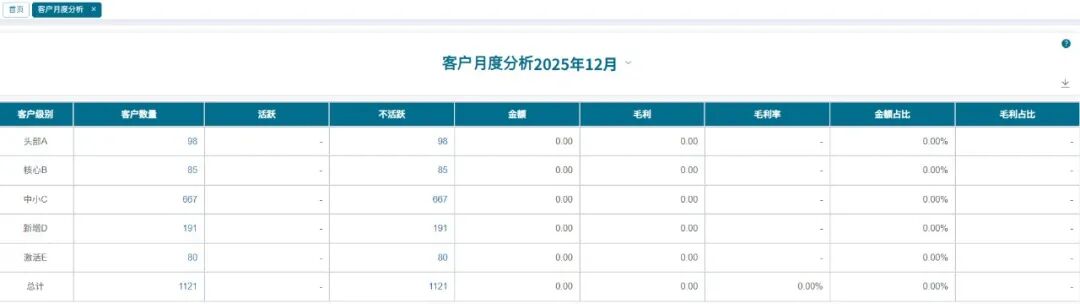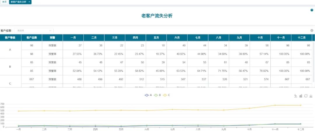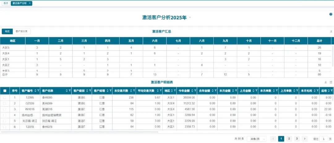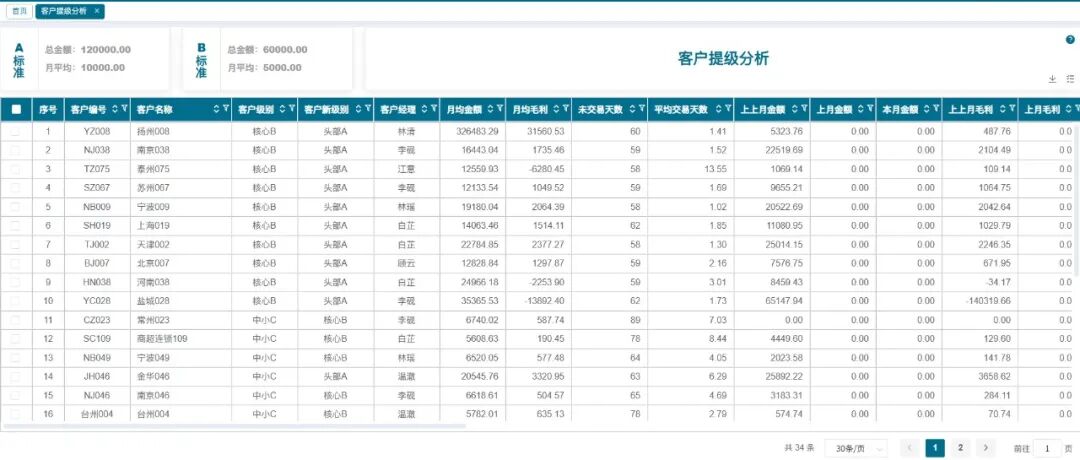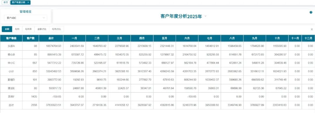 可快速查看每个月每个级别的客户是否活跃以及相关数据,从而重点关注 ab 类不活跃客户清单,及时处理重要客户异常。