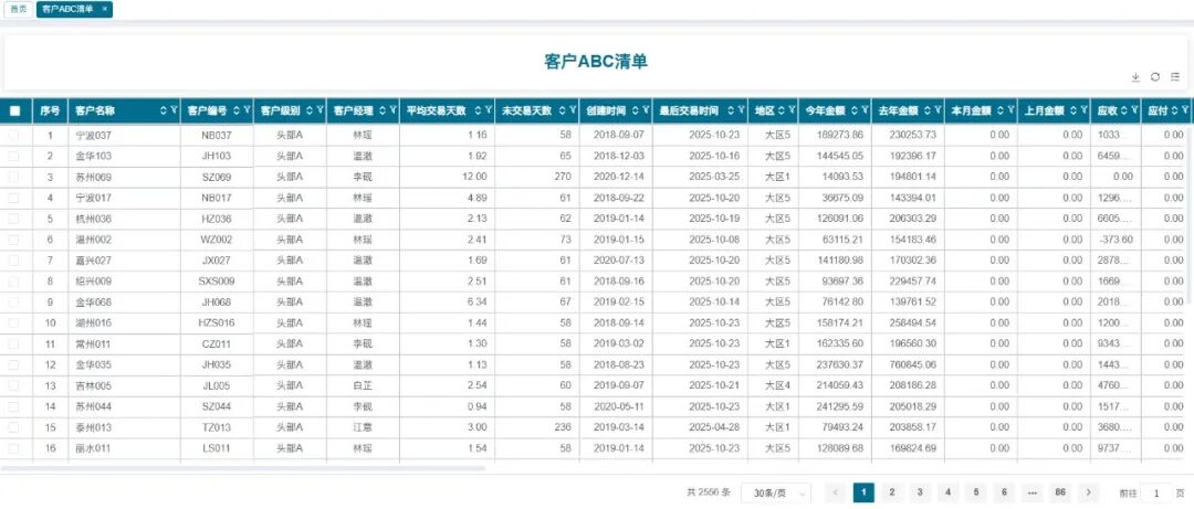 可快速查看各等级明细客户核心指标,如平均交易天数、今年金额、去年金额、本月金额、应收、退货金额及退货率等。