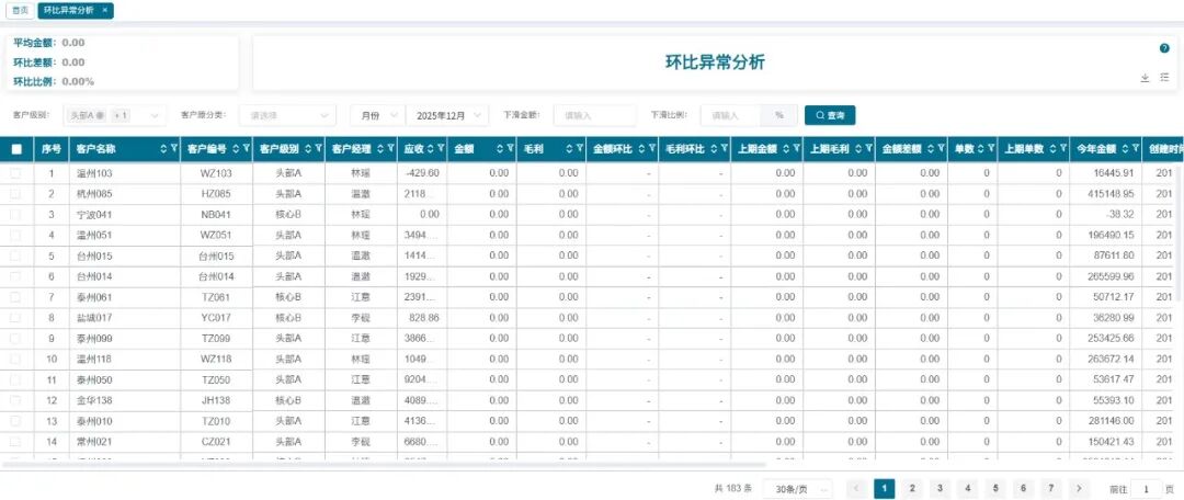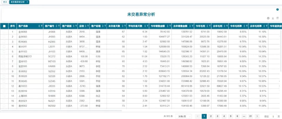 显示客户的平均业绩和增长,快速定位异常客户。通过筛选找出低于平均值,低于预期值,负增长异常客户,联系业务人员处理。