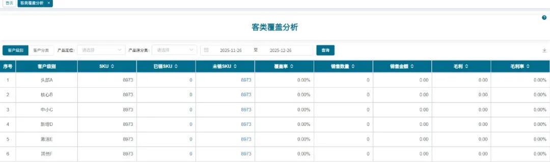 显示不同范围的产品在当前分类客户中的整体覆盖率。关注 AB 类重点客户覆盖率是否偏低。