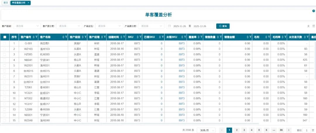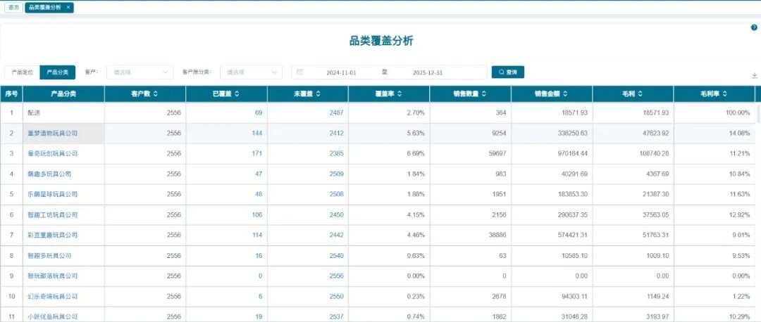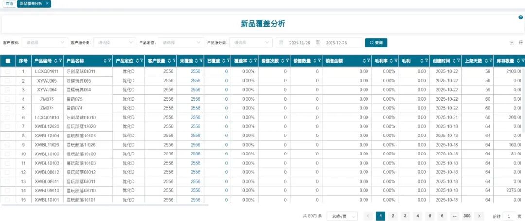 可查看不同范围的客户在当前分类新品中的整体覆盖率。关注具体客户的新品未覆盖。