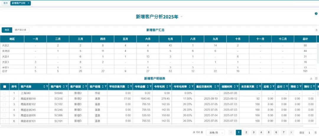 显示每个月每个类别新增客户数量来源和新增具体客户明细信息。重点关注新增客户的来源,调整获客策略。
