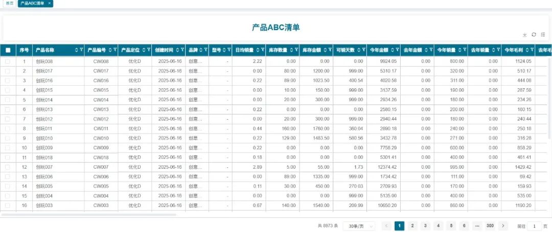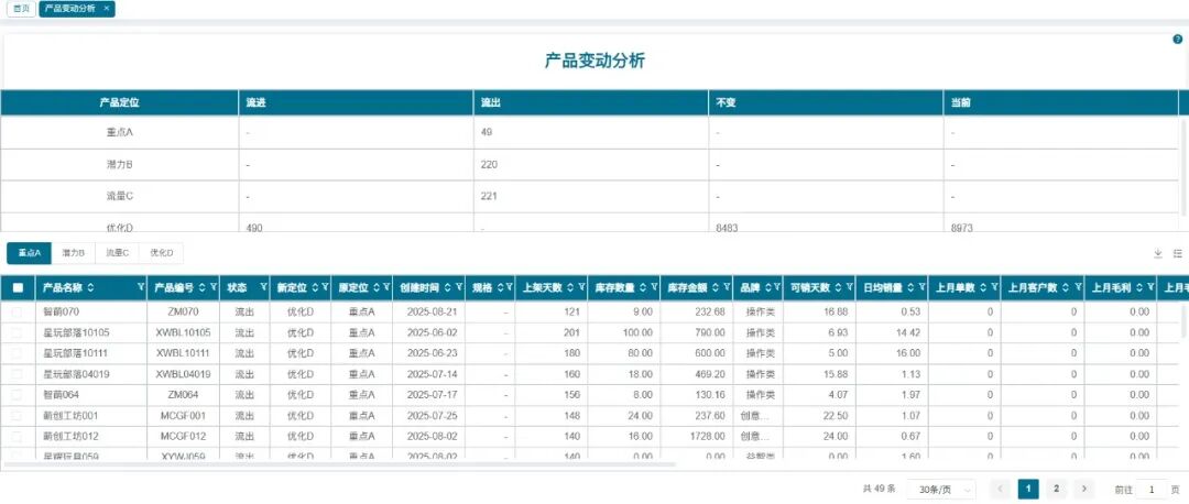 汇总显示每个定位产品的变动情况和变动产品详情。及时调整产品销售、采购策略,重点关注 A、C 两类产品的流进流出。
