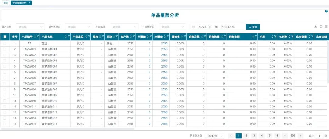 可查看不同范围的客户在某一产品中的覆盖率。作为业务人员具体执行推品时的清单。