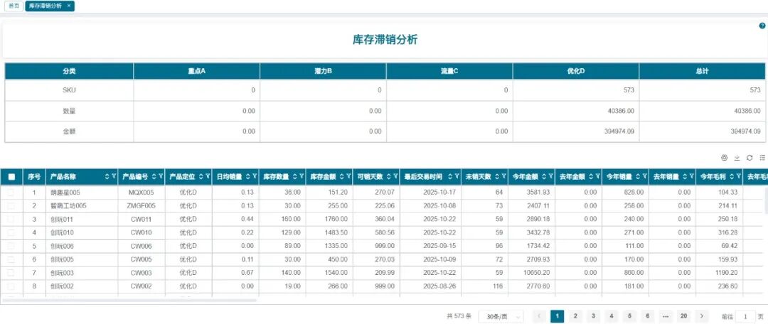 汇总表记录当前每个定位滞销产品的库存金额和库存数量。详情显示具体滞销清单,及时关注滞销产品。
