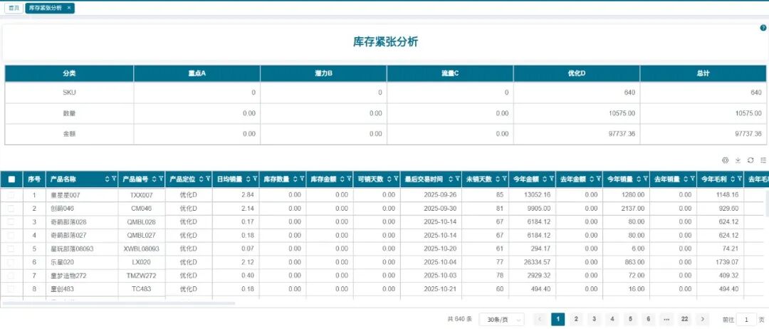 汇总表记录当前每个定位紧张产品的库存金额和库存数量。详情显示具体滞销清单,及时关注紧张产品。