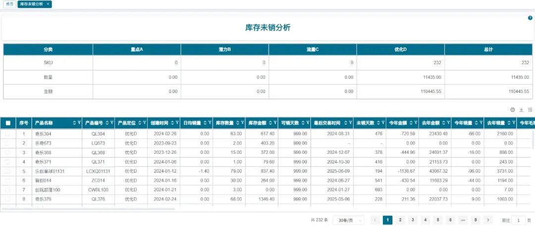 汇总表记录当前每个定位未销产品的库存金额和库存数量。详情显示具体滞销清单,及时关注长期未销产品。