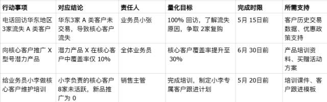 ◦优先级 A(紧急重要):影响核心指标(销售额、毛利)、涉及头部客户 / 重点产品的行动,如 “回访流失 A 类客户”“处理库存紧张的重点产品”;