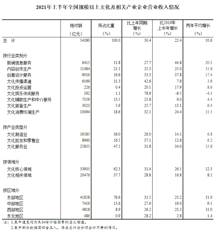 五大行业营业收入两年平均增速快于2019年上半年。从营业收入看,上半年文化及相关产业整体发展已恢复到疫情前水平,多数行业甚至好于疫情前水平。文化及相关产业9个行业中,创意设计服务、内容创作生产、文化消费终端生产、文化装备生产等4个行业两年平均增速分别为17.4%、11.8%、11.5%和6.4%,比2019年上半年增速加快5.0、2.0、4.5和1.1个百分点;文化辅助生产和中介服务由2019年上半年下降2.0%转为两年平均增长4.4%。受疫情影响最严重的文化娱乐休闲服务延续一季度强劲反弹态势,比上年同期增长78.9%,两年平均增速下降4.3%,降幅比一季度收窄4.9个百分点。文化新业态引领产业发展。从文化及相关产业细分行业看,动漫游戏、视频直播、数字出版等“互联网+文化”新业态保持强劲增长态势。上半年,文化新业态特征较为明显的16个行业小类实现营业收入18204亿元,比上年同期增长32.9%,占全部文化企业营业收入的比重为33.5%,比上年同期提高0.6个百分点;两年平均增长25.3%,高于全国文化企业平均水平14.7个百分点。其中,互联网广告服务、娱乐用智能无人飞行器制造、可穿戴智能文化设备制造3个细分行业营业收入两年平均增速均超过30%。文化产业区域发展面扩质升。上半年,全国31个地区文化企业营业收入同比全部实现正增长;27个地区两年平均增速实现正增长,比一季度增加2个地区;22个地区两年平均增速快于2019年上半年,比一季度增加1个地区。从区域看,东部地区实现营业收入41658亿元,同比增长31.5%,两年平均增长11.0%;占全国的比重为76.6%,比上年同期提高0.6个百分点。国家统计局社科文司高级统计师张鹏认为,下阶段,随着我国经济运行稳中加固、稳中向好,文化市场供需潜能稳步释放,文化及相关产业有望保持向好发展态势。近年来,在互联网、大数据、人工智能、VR/AR等高科技引领下,消费方式和消费场景不断推陈出新,许多文化产业新业态正在崛起,文化新业态保持强劲增长态势,引领作用进一步增强。作为国家级文化产业示范园区,曲江新区依托大数据、云计算、人工智能、区块链等新一代科学技术,促进数字内容技术与文化产业的创新融合,催生出一批文化新场景、新消费、新业态,文化产业新业态发展势头强劲。