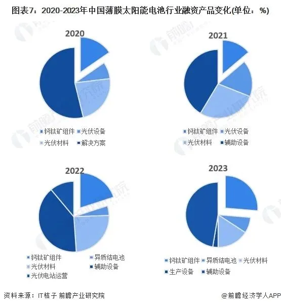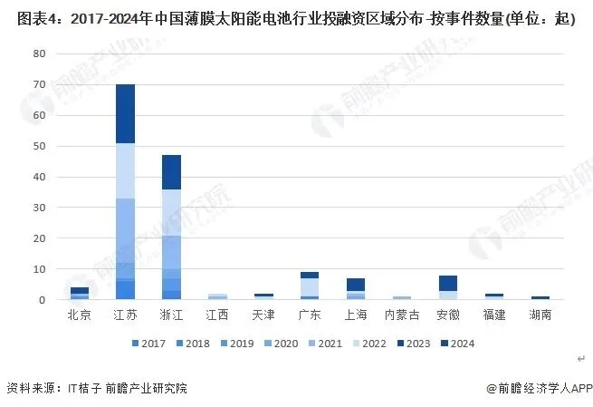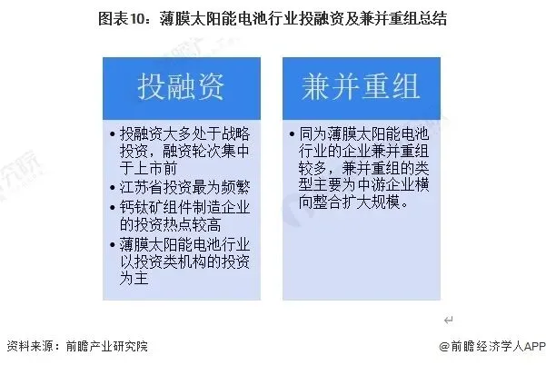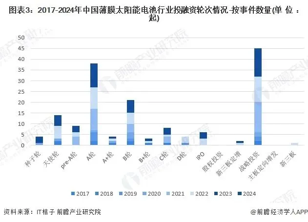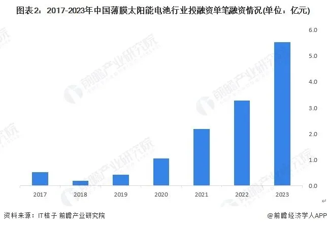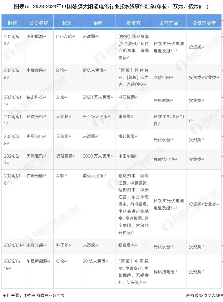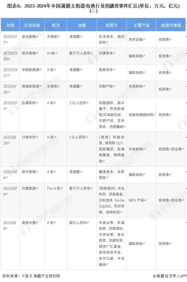 本文核心数据:行业整体融资金额;行业投融资轮次分布根据IT桔子数据,2017-2023年期间,我国薄膜太阳能电池行业共发生了160起融资事件,投融资活跃度呈增长态势。2021年以来薄膜太阳能电池行业投融资事件快速上升,2023年融资金额达475亿元。2024年1月1日至5月10日共发生了8起融资事件。从平均单笔融资金额来看,2017-2023年,薄膜太阳能电池行业平均单笔融资金额为波动上升态势。2020年以来平均单笔融资金额加速上升。到2023年平均单笔融资金额达5.5亿元。从薄膜太阳能电池的投资轮次分析,2018-2021年,行业以A轮与战略投资为主。2022-2024年,融资轮次更为丰富,体现出初创型、成长型企业快速发展,行业融资以天使轮、股权融资为主。现阶段,中国薄膜太阳能电池行业资本现阶段仍然倾向于投资初创、新兴企业。从薄膜太阳能电池行业的企业融资区域来看,目前江苏的融资事件最多,2017-2023年累计达到70起。同时,浙江、广东、上海等地的薄膜太阳能电池投融资活跃度也较高。2023-2024年我国薄膜太阳能电池行业的主要投融资事件如下:从2020-2023年融资企业的主营产品分析,近年来薄膜太阳能电池行业投融资集中于钙钛矿电池领域,近年来相关投资愈发频繁。根据对薄膜太阳能电池行业投资主体的总结,目前我国薄膜太阳能电池行业的投资主体主要以投资类为主,代表性投资主体有中泰证券、中信证券等等;实业类的投资主体有中国华能、浩坤科技等。由于国内薄膜太阳能电池行业属于新型光伏组件领域,同业间发生兼并的事件较多,目前兼并重组的类型主要为中游企业横向整合。从我国薄膜太阳能电池行业投融资现状来看,目前我国薄膜太阳能电池市场投融资活动呈增长态势,但整体投融资及兼并重组事件较少。我国薄膜太阳能电池行业投融资及兼并重组现状总结如下:同时前瞻产业研究院还提供产业大数据、产业研究报告、产业规划、园区规划、产业招商、产业图谱、智慧招商系统、行业地位证明、IPO咨询/募投可研、专精特新小巨人申报等解决方案。在招股说明书、公司年度报告等任何公开信息披露中引用本篇文章内容,需要获取前瞻产业研究院的正规授权。