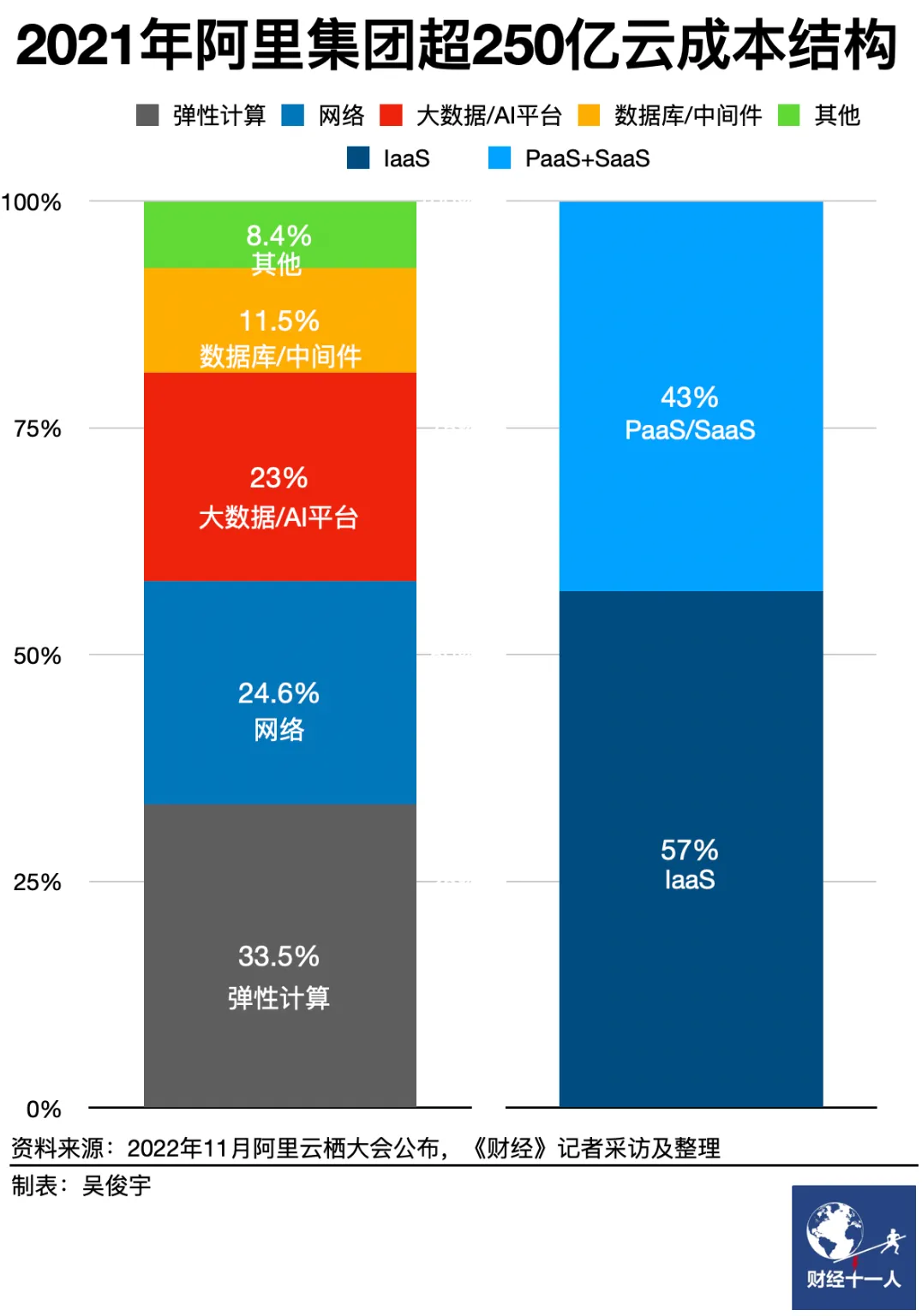 阿里云AI计算产品体系分层了三层:IaaS层是GPU等智能算力资源;PaaS层是机器学习平台;MaaS层包括基础大模型、企业专属大模型等。阿里云已经用公有云AI算力和通用/行业模型服务了自动驾驶、互联网等行业的企业。2022年,阿里云在乌兰察布启用了以GPU芯片为主的智算中心,并对外提供AI算力、AI大模型等服务。比如,小鹏汽车使用阿里云的算力、模型训练数据,以此提高自动驾驶训练速度。微博等互联网公司也采用了阿里云的机器学习平台模型数据,以此进行信息流推荐。随着国内上云、用云程度变深,AI计算的使用占比会逐渐变大。互联网行业正在出现这种变化。因为数据分析、信息推荐都高度依赖AI计算和模型服务。第三方数据分析机构Gartner数据显示,2021年中国云市场的支出结构中,IaaS占据70%,SaaS/PaaS只占30%。但阿里集团这种用云程度深的企业呈现了更超前的支出结构:IaaS占比不足60%,AI和数据分析占更大比重。2022年云栖大会上,阿里集团基础设施负责人曾公开表示,阿里集团2021年自身用云成本超过250亿,其中23%用于是大数据和AI平台,该负责人表示,随着用云程度变深,其他互联网公司甚至是传统企业,未来可能也会呈现类似用云成本结构。
