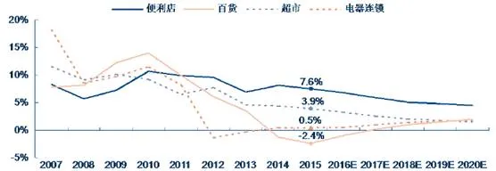 2016-2020年中国百货、超市、电器连锁和便利店业态销售额及增速预测