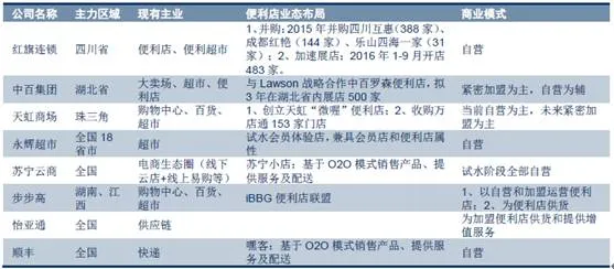 资本踊跃进入,传统零售龙头布局便利店有望“后来者居上”。中百集团、天虹商场、永辉超市(会员体验店)、苏宁云商(苏宁小店)、步步高(iBBG 便利店联盟)、怡亚通、顺丰等不同领域的产业资本和金融资本纷纷加大了对便利店领域的投资。传统商业龙头布局便利店起步较晚,但有望“后来者居上”:1. 已具备商品供应链、物流、会员资源,布局便利店和原有业态形成协同;2. 主要采取直营和紧密加盟(收入分成、费用分担)模式,管理规范,易于标准化复制。