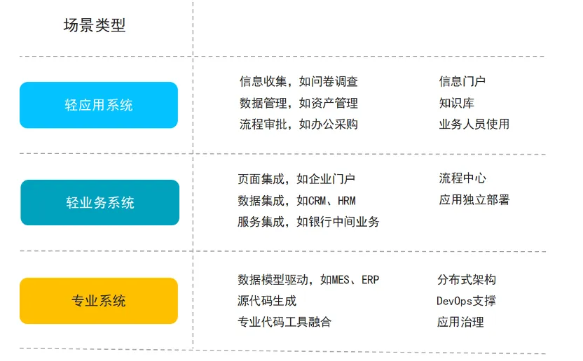 但是在金融行业,传统的表单或者模型驱动的低代码开发已经不能完全适用金融复杂业务系统的建设;我们讲金融行业的应用系统可以分为三类,轻应用系统、轻业务系统以及专业系统,对于轻业务系统,比如OA等管理类系统,主要流程审批、信息收集为主,那我们使用零代码的方式就可以快速的建设应用系统。而对于轻业务系统以及专业系统我们就需要有大量的技术组件和业务组件通过服务编排来完成应用系统的建设;