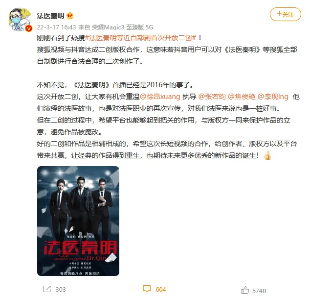 两家宣布合作后,搜狐平台热播剧集《法医秦明》的原著作者秦明在微博发表了一条更新。他说,开放二创是对法医职业的再次宣传,对法医来说是好事一桩。但在二创的过程中,希望平台也能够起到把关作用,和版权方一起来保护作品的利益,避免作品被魔改。