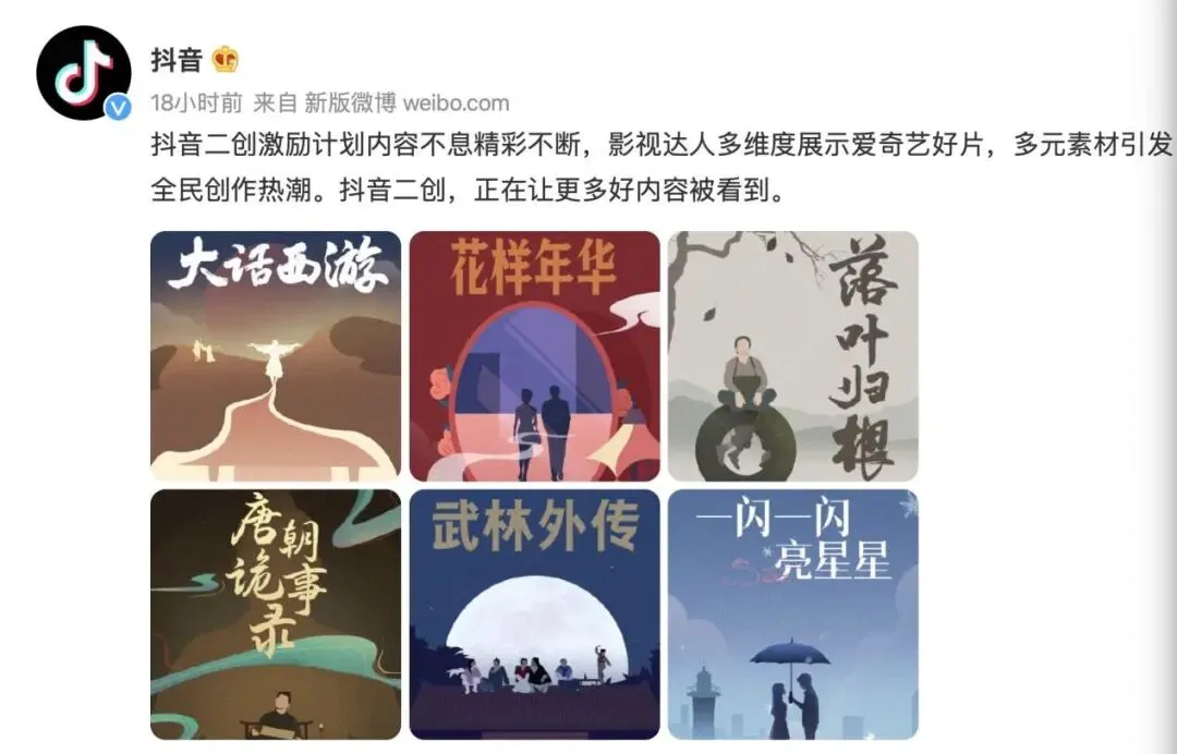 今年7月,抖音和爱奇艺达成合作。抖音集团官方账号宣布,双方将围绕长视频内容的二次创作与推广等方面展开探索,促进长短视频平台合作共赢。