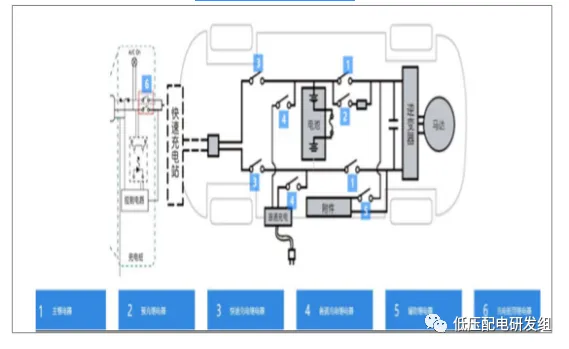 目前市场主流新能源乘用车型,采用2主继电器,多辅助继电器的模式(根据设计不同分别需求4-8只辅助继电器不等)。