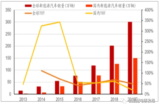 目前全球尤其是国内新能源汽车销量仍保持高速增长,2013年以来年复合增速近70%。